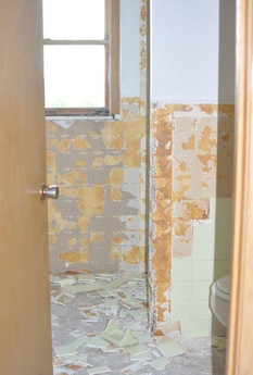 The next task that Dad happily took on was knocking out walls. There was a "pony wall" in the middle of the living room that made it feel very closed in, and we knocked that out. The kitchen was kind of a separate "room" with just a doorway, and we opened that up by knocking out basically the whole wall between the kitchen/dining room and the living room. Now there is a much larger walkway between the living room and dining room, and it's all completely open from the kitchen into the living room. It makes the space feel SO much bigger. That was the only major demolition that we had to do, besides tearing out all of the old shower walls. I also had the carpenters to add a little broom closet off of the dining room. That space used to be wasted, as it was a cabinet in the main bathroom that was just in the way, behind the door. Other than those things, I kept the layout of the house exactly the same.